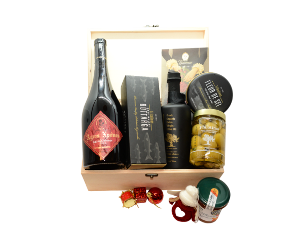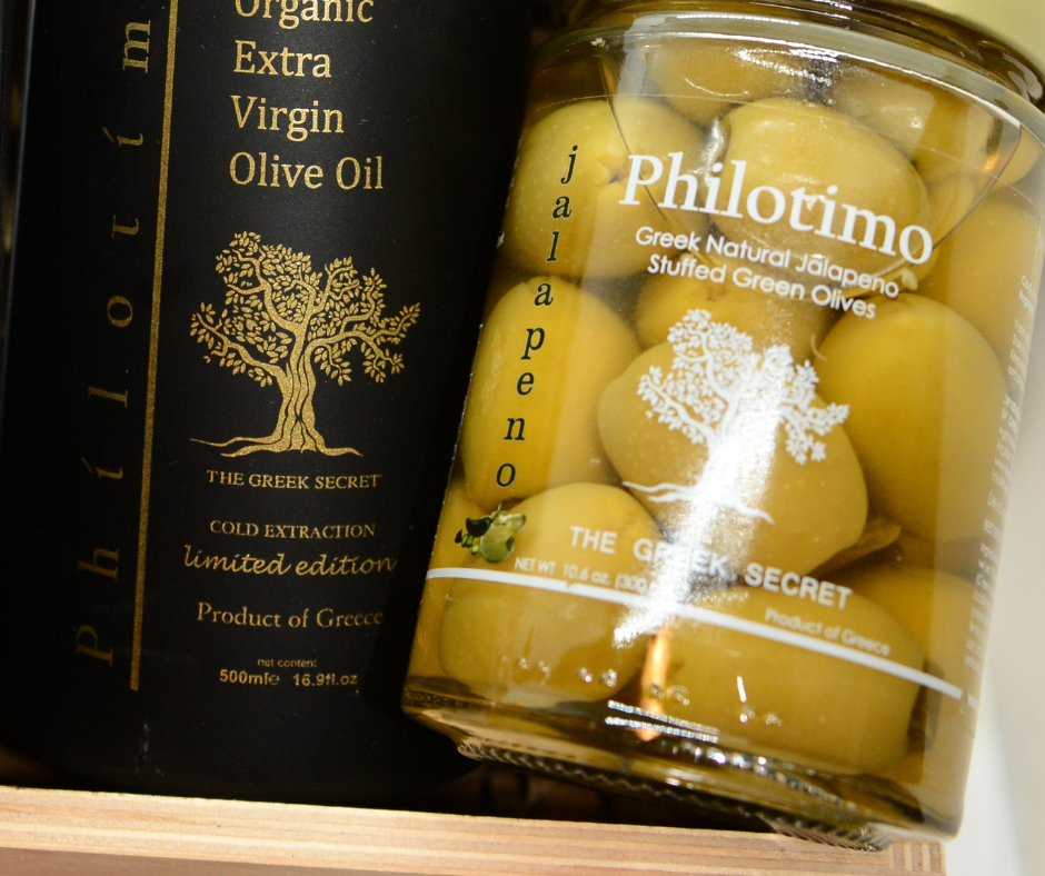 Setul reunește o selecție premium de delicatese grecești: ulei extravirgin de măsline Philotimo Bio,