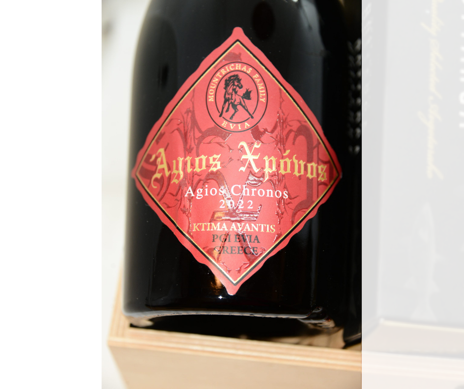 sec Agios Chronos, un cupaj elegant Syrah–Viognier provenit din Insula Evia.