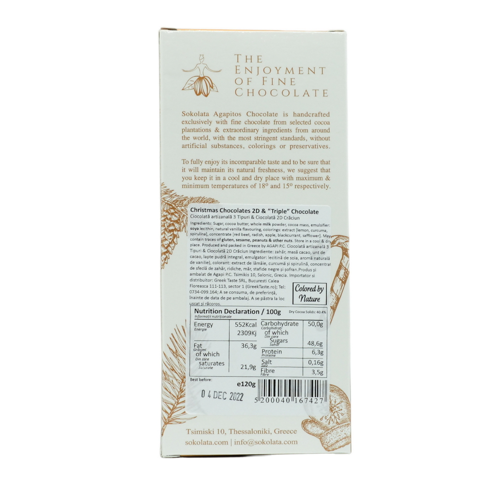 - ciocolată 2D Crăciun artizanală realizată cu cacao de cea mai bună calitate într-unul dintre cele mai vechi și apreciate laboratoare de ciocolată din Salonic;