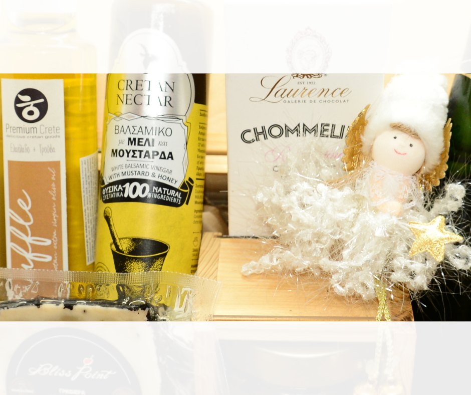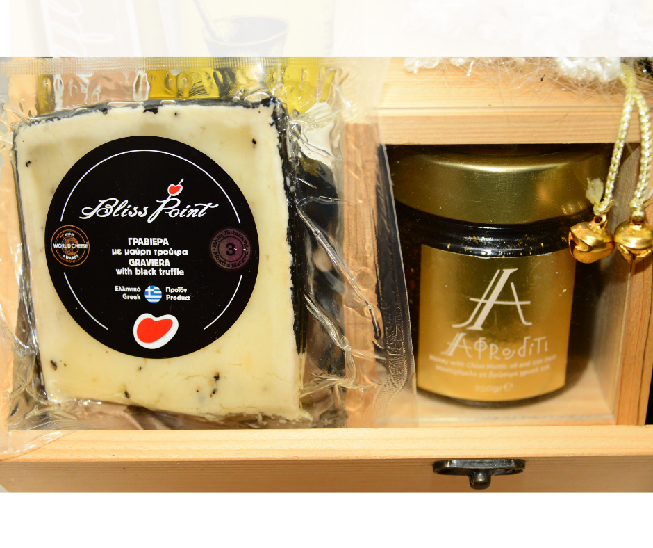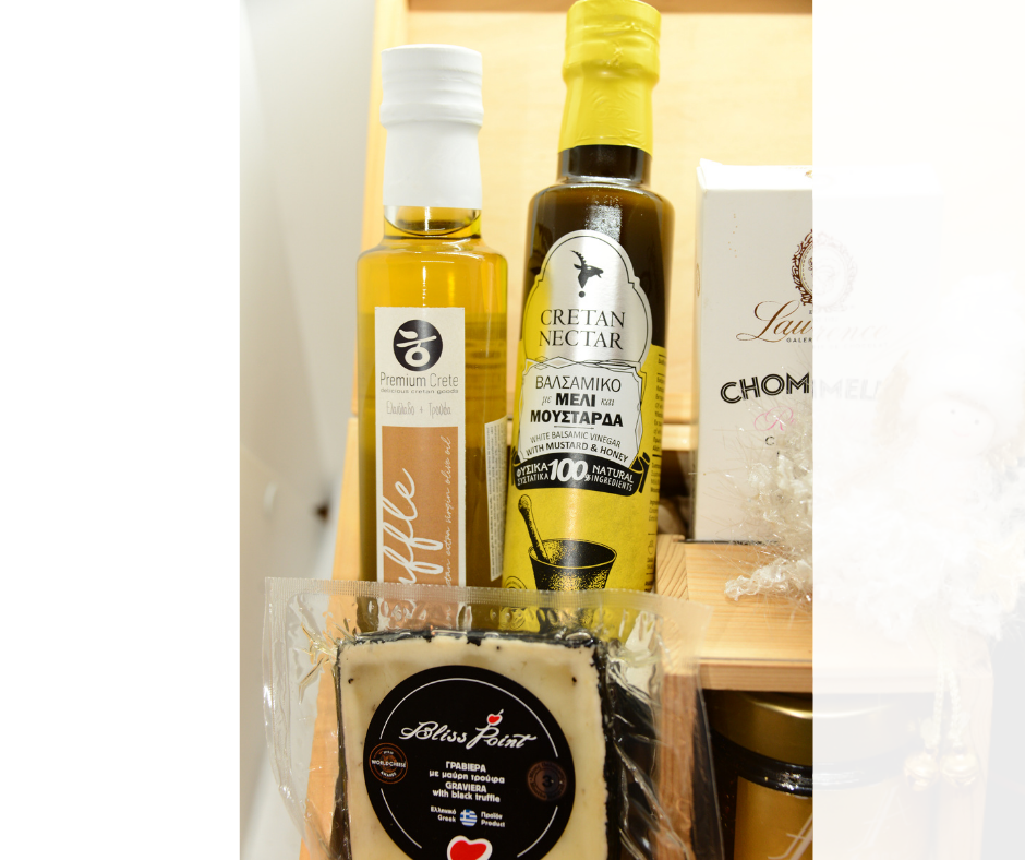 Setul include ulei extravirgin de măsline cu trufe din insula Creta, oțet balsamic cu miere și muștar de la Cretan Nectar, gravieră maturată cu trufe, miere naturală cu mastică din Chios prezentată într-o cutie