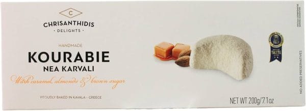 - Kourabie cu migdale si caramel 200gr este o prăjitură tradițională grecească, foarte apreciată pentru gustul său sofisticat;
