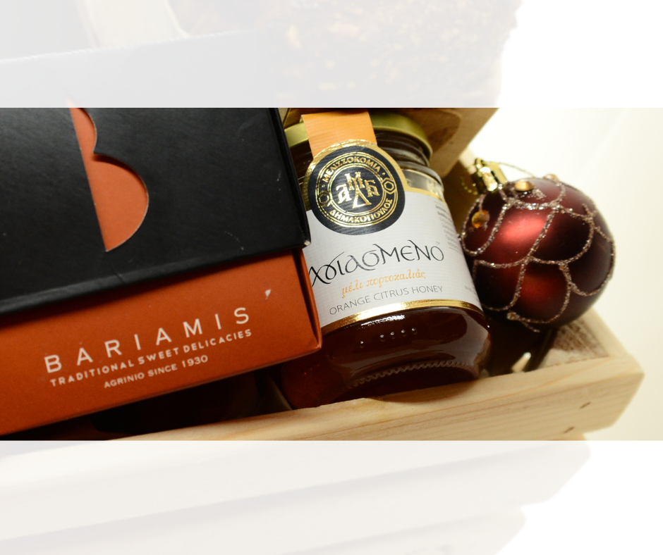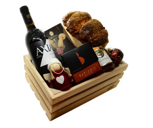 Coșul include miere naturală de portocale, un Greek Delight Lux cu scorțișoară și portocale, o tabletă de ciocolată artizanală Laurance, un tsoureki (cozonac grecesc) tradițional umplut cu cremă de praline și învelit în ciocolată cu lapte, precum și vinul roșu sec Axia 2021, un cupaj Syrah–Xinomavro de la Alpha Estate, apreciat pentru caracterul său elegant și rotund.