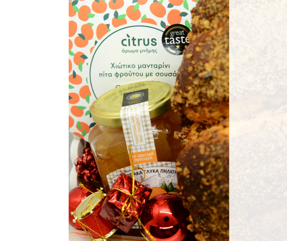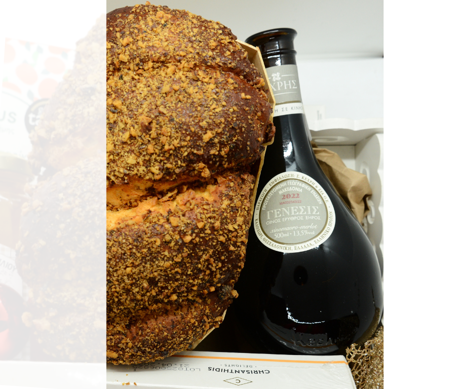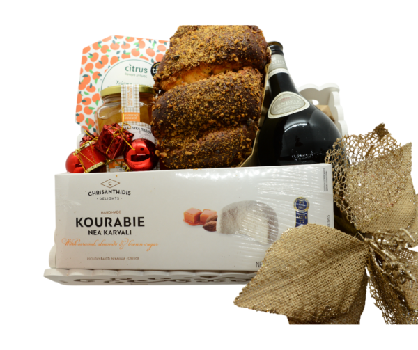 În acest pachet găsești un tsoureki generos cu cremă de praline, kourabie fragede cu migdale sau alune caramelizate, dulceață tradițională de portocale sau bergamotă, un pie de mandarine din Chios, alături de vinul roșu sec Genesis, un cupaj Xinomavro–Merlot apreciat pentru echilibrul și finețea lui.